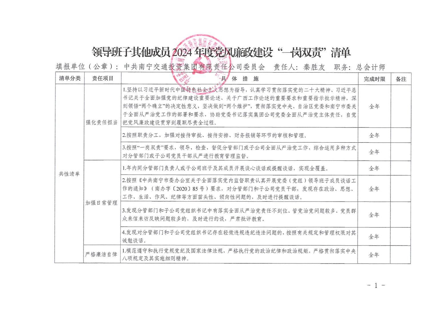 領導班子其他成員2024年度黨風廉政建設“一崗雙責”清單(六)