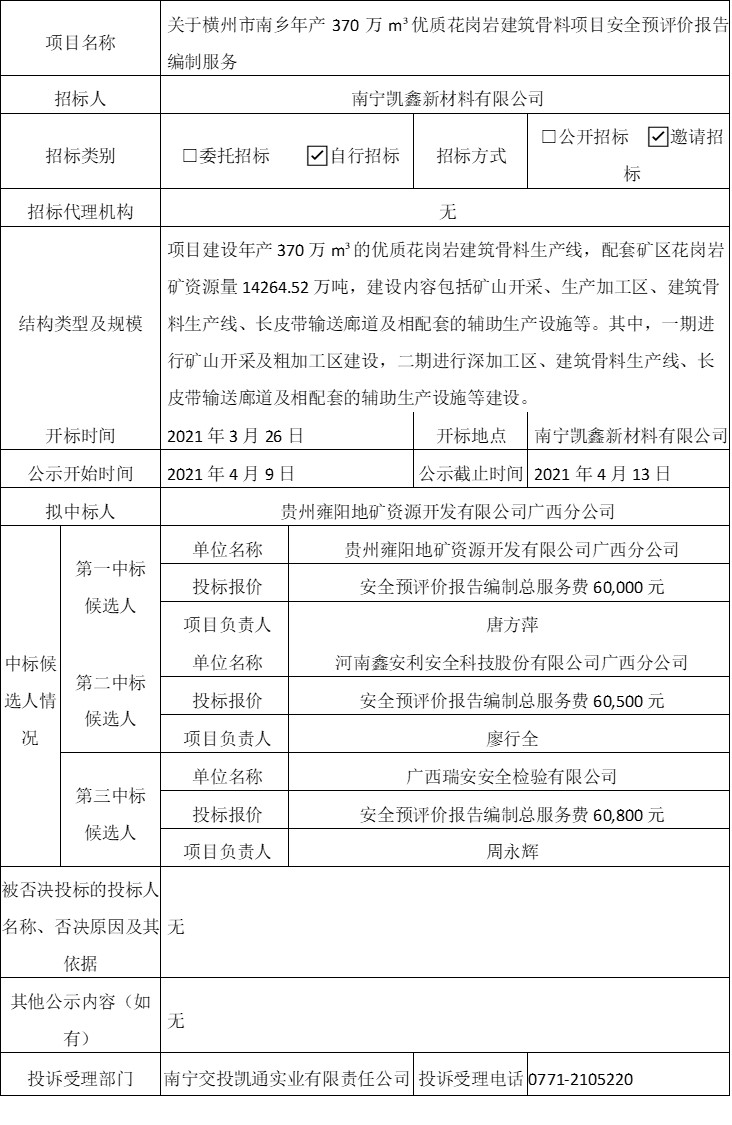 南寧交投凱通實業(yè)有限責(zé)任公司轉(zhuǎn)讓南寧凱鑫新材料有限公司51%股權(quán)專項審計中介機構(gòu)公開選聘于2021年4月2日結(jié)束,經(jīng)評審,現(xiàn)將中標(biāo)結(jié)果公示如下:項目名稱:選聘轉(zhuǎn)讓南寧凱鑫新材料有限公司51%股權(quán)專項審計一、開標(biāo)日期:2021年4月2日10:30二、中標(biāo)單位:致同會計師事務(wù)所(特殊普通合伙)廣西分所中標(biāo)金額:人民幣壹萬捌仟元整(¥:18,000.00)三、招標(biāo)人單位地址:南寧市青秀區(qū)銅鼓嶺路1號藍(lán)寶國際雅玉閣B302號商鋪聯(lián)系人姓名和...